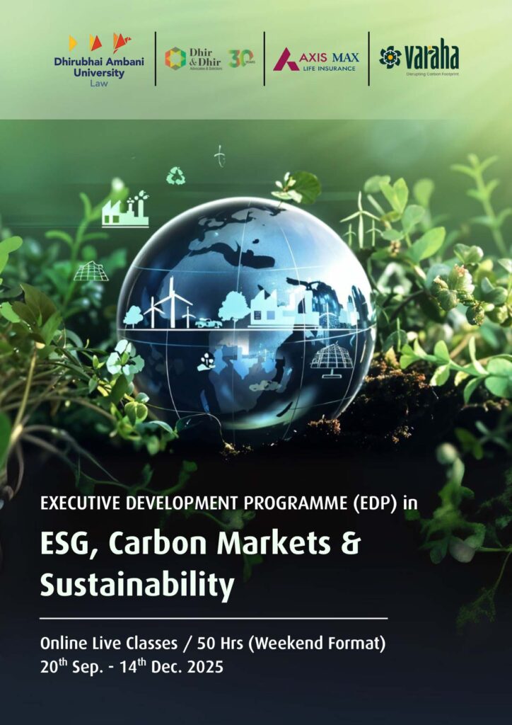 The Executive Development Programme in ESG, Carbon Markets & Sustainability represents a pioneering initiative by Dhirubhai Ambani University – School of Law, designed to address the critical convergence of environmental stewardship, social responsibility, and corporate governance in today’s business landscape. This comprehensive program equips senior executives and legal professionals with the strategic insights needed to navigate the evolving regulatory frameworks governing sustainability and carbon markets.